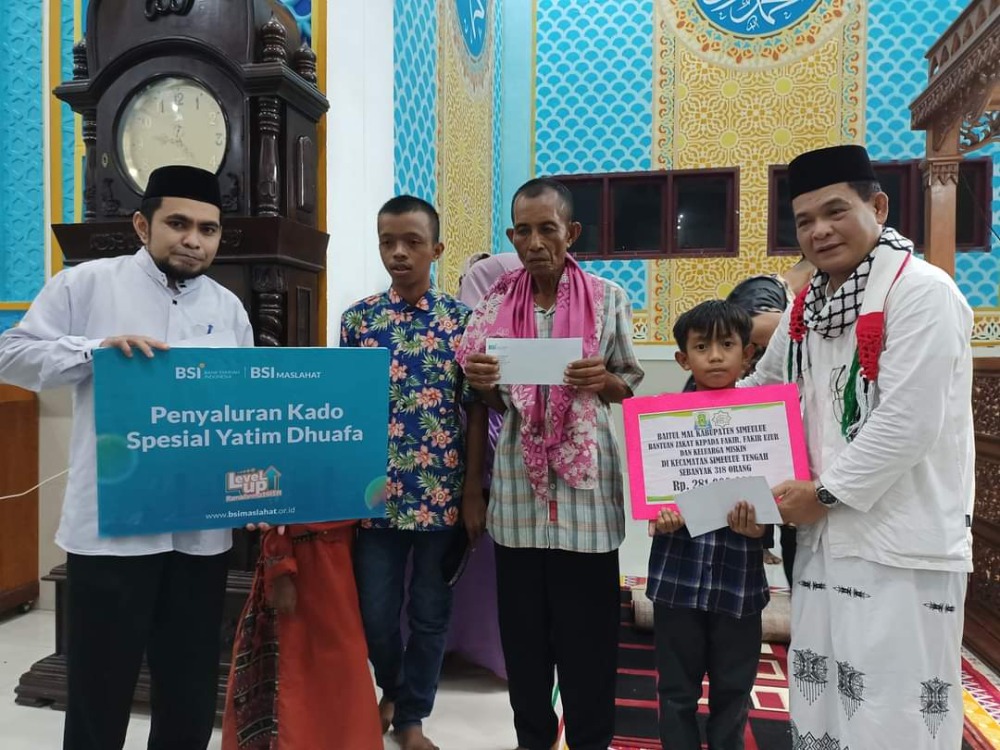 Pada kesempatan tersebut, Pj. Bupati Simeulue, Ahmadlyah, SH didampingi oleh Ketua Badan Baitul Mal Kabupaten Simeulue, Supriadi menyerahkan secara simbolis Zakat yang terdiri dari senif Fakir Uzur, Fakir, dan Miskin senilai Rp. 281.000.000. Zakat tersebut nantinya akan disalurkan kepada 318 Mustahik yang ada di Kecamatan Simeulue Tengah. Selain itu, Pj. Bupati Simeulue juga menyerahkan Kado Spesial Yatim Dhuafa dari Bank Syariah Indonesia (BSI) yang bekerja sama dengan Baitul Mal Kabupaten Simeulue yang diperuntukkan bagi anak-anak yatim dan kaum dhuafa.