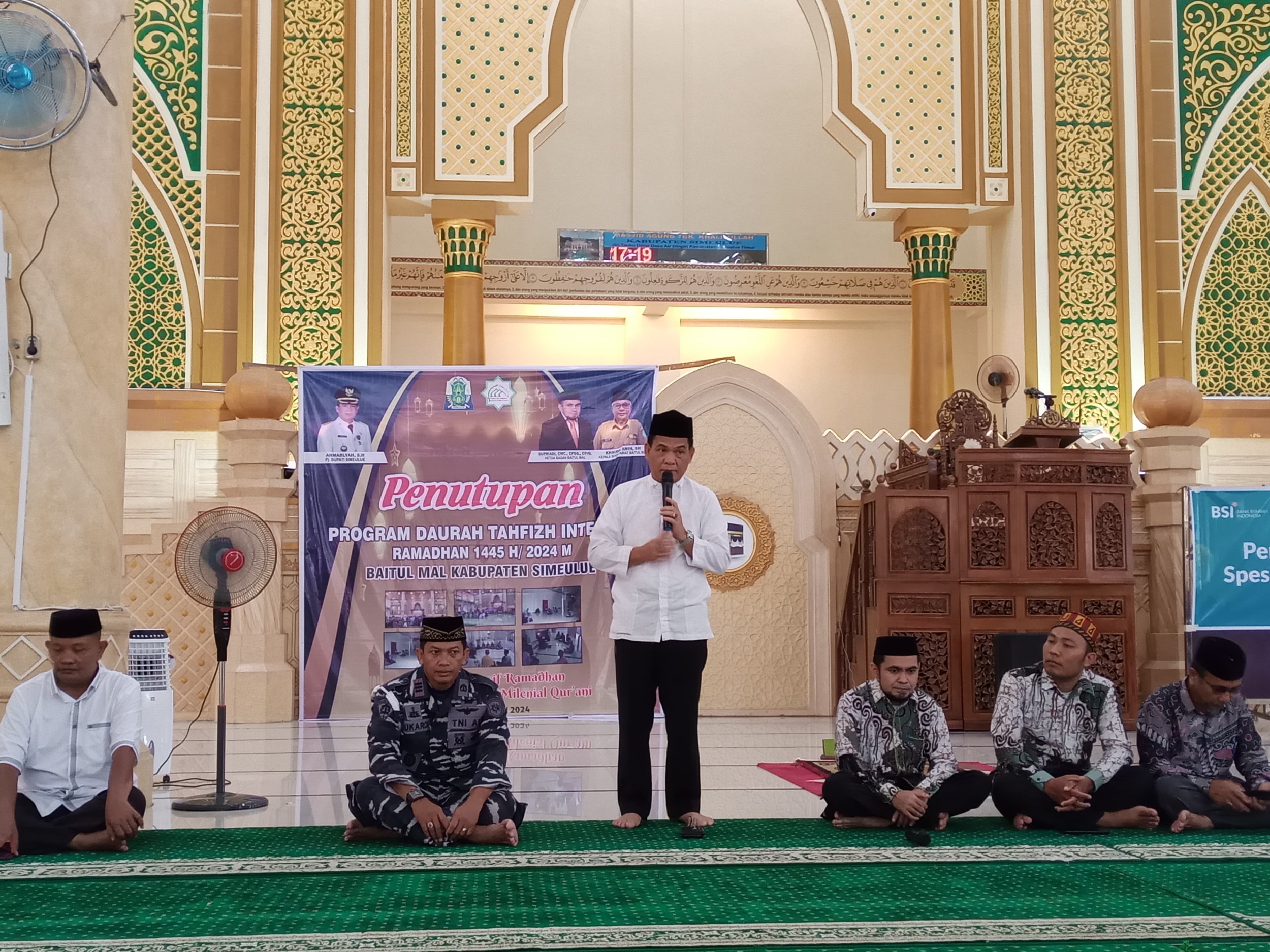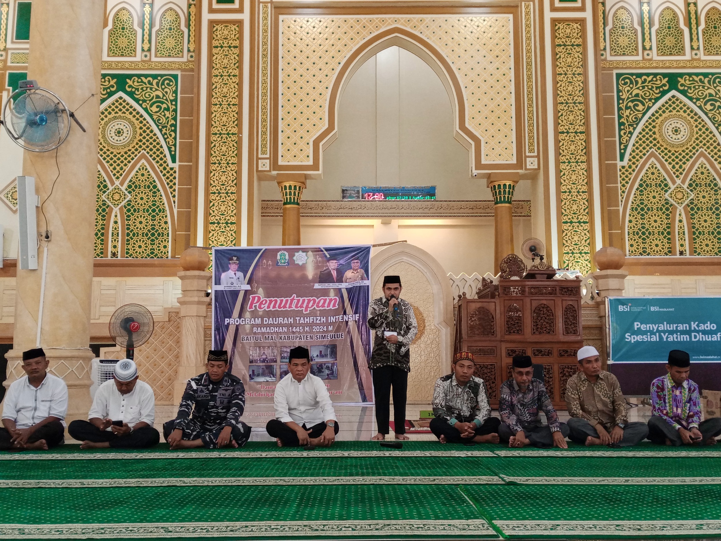 Pj. Bupati Simeulue, Ahmadlyah, SH resmi menutup Program Daurah Tahfidz Intensif Baitul Mal Kabupaten Simeulue pada Kamis, (4/4) di Ruangan Masjid Agung Tgk. Khalilullah Kabupaten Simeulue. Kegiatan tersebut sekaligus dirangkai dengan penyerahan secara Simbolis Zakat kepada Fakir dan miskin senilai Rp. 3.250.000.000,- bagi 3.680 Mustahik (penerima manfaat). Selain itu, Bupati Simeulue juga menyerahkan Kado Spesial Yatim Dhuafa dari Bank Syariah Indonesia yang bekerja sama dengan BMK Simeulue.